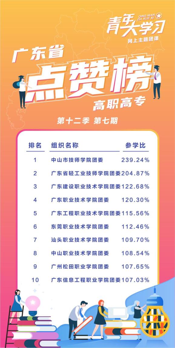 从高职高专院校参学情况看,中山市技师学院、广东省轻工业技师学院、广东建设职业技术学院、广东职业技术学院、广东工程职业技术学院、东莞职业技术学院、汕头职业技术学院、中山职业技术学院、广州松田职业学院、广东信息工程职业学院、广州华商职业学院、广东环境保护工程职业学院、江门职业技术学院、广东财贸职业学院、广东轻工职业技术学院、广东农工商职业技术学院、广东江门幼儿师范高等专科学校等17所院校参学比超100%。其中中山市技师学院、广东省轻工业技师学院、广东建设职业技术学院位列榜单前三,全省高职高专院校总参学比已达到85.98%,持续保持稳定。