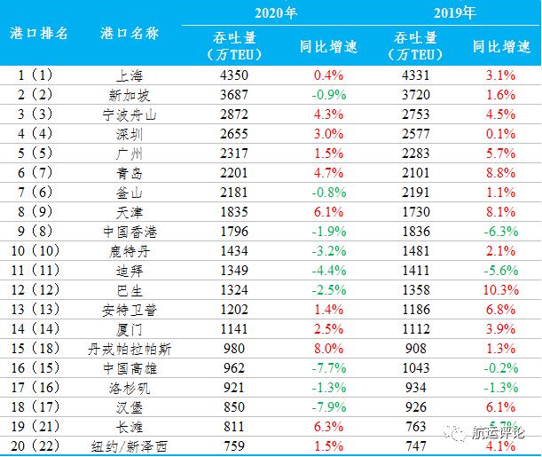 2020年全球前20大集装箱港口集装箱吞吐量排名