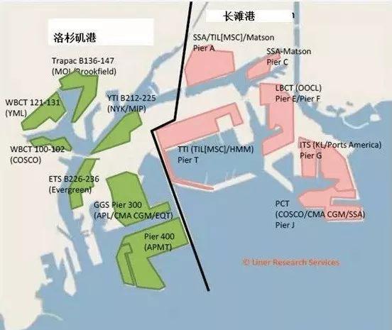 洛杉矶港和长滩港码头几乎完全挨在一起