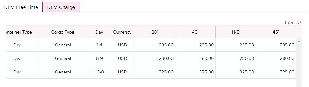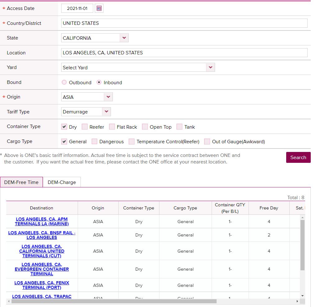 海洋联船公司(ONE)在洛杉矶港滞箱费标准(来自ONE官方网站)