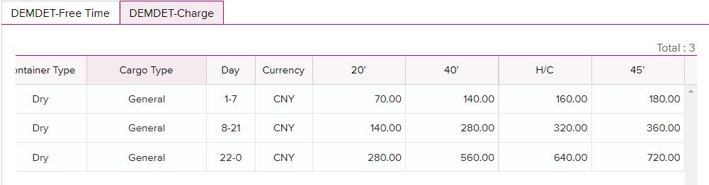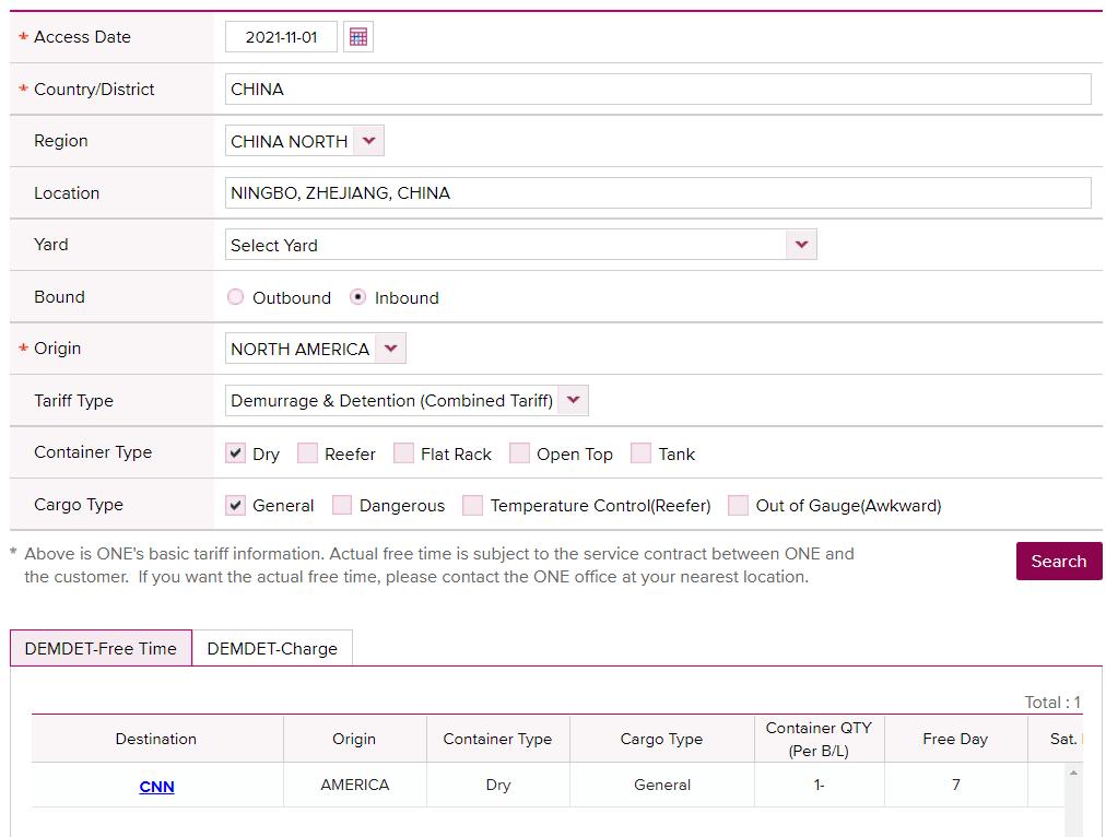 海洋联船公司(ONE)在宁波港滞箱费标准