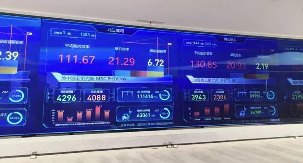 宁波港码头控制室显示屏实景,右边显示是梅山码头,左边显示北三集司就是梅山码头封闭期间多数船舶改挂靠的四期穿山码头(作者供图)