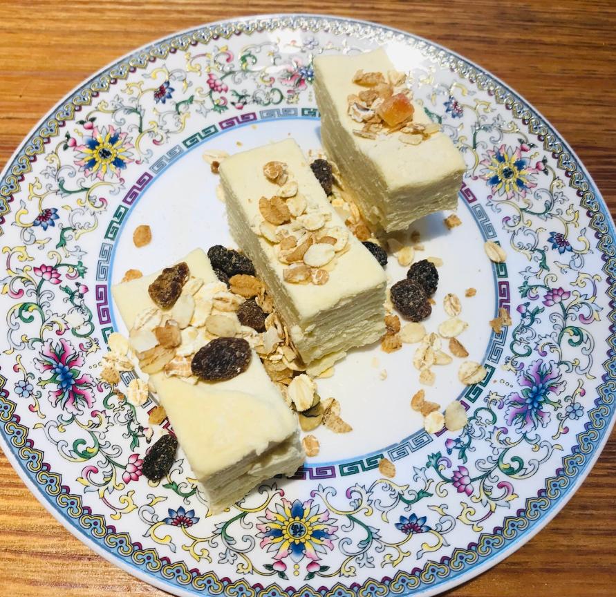 奶皮酥,是奶皮子加入各种新疆特色的坚果、果酱、玫瑰花酱做成的点心,味道比奶更浓郁,咬一口,外皮瞬间在舌尖化开,奶香、果香和坚果香就充斥整个口腔。