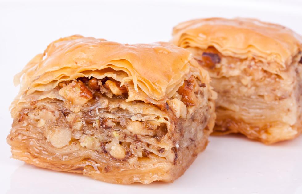 巴克拉瓦的上、下是多层用黄油刷过的酥皮,很薄的酥皮一层一层裹着开心果、核桃、开心果等切碎的坚果,烤好后,再在上面浇上一层糖浆或蜂蜜。形状常见的有方形、菱形和三角形,通常是烤前就切成形,成品色泽金黄,口感酥松香脆,有黄油和蜜糖的清香。