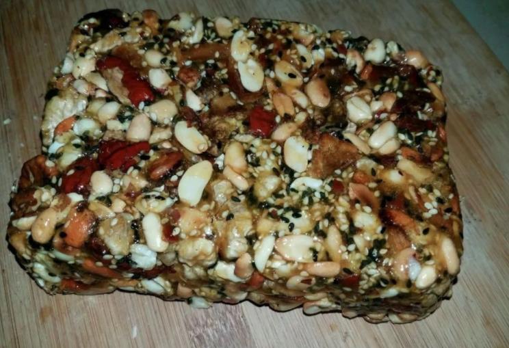 玛仁糖选用核桃仁、玉米饴、糯米、葡萄干、葡萄汁、芝麻、玫瑰花、巴旦杏、枣等原料,蒸熟后趁热放进木槽之中,压一些重物,这样成品就被压得很紧实,像压缩饼干一样,密度极大,非常顶饿。