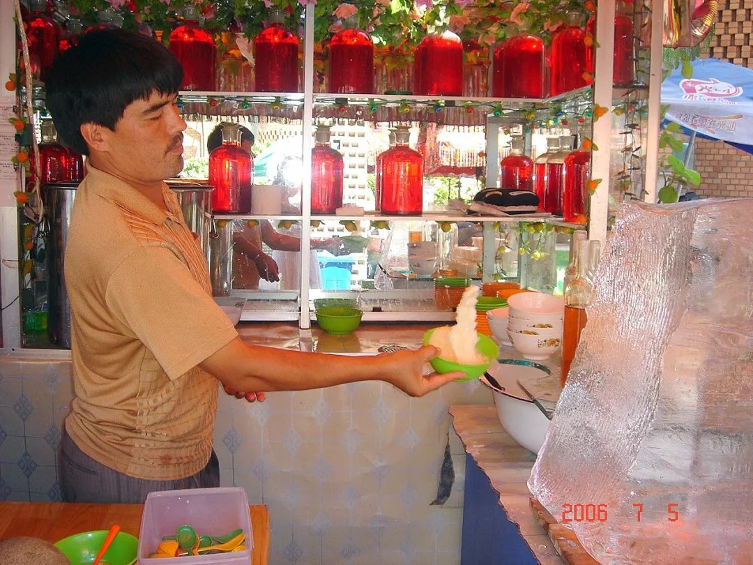 每到了夏天,新疆的街上会出现一种超级有人气的美食——果酱酸奶和果酱刨冰,将冰块用工具凿成小碎块,用碗接住,然后加点果酱或蜂蜜,加一勺酸奶,再撒一把坚果粒、葡萄干,一碗纯天然的新疆刨冰就做成了。