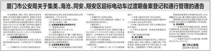 为加强集美、海沧、同安、翔安区电动车管理,切实维护道路交通秩序,根据《市场监管总局 工业和信息化部 公安部关于加强电动自行车国家标准实施监督的意见》(国市监标创〔2019〕53 号)和《厦门经济特区道路交通安全若干规定》,决定在集美、海沧、同安、翔安区对超标电动车实行过渡期备案登记,发放有效期至2023年12月31日的备案标识。现将有关事项通告如下: