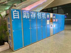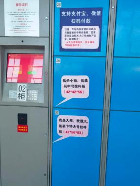 ▲自动存包机可以暂存42*56*83的大号拉杆箱,也可以暂存42*42*56的中号拉杆箱,根据寄存时间对应收费标准。自动存包机支持支付宝、微信扫码支付。