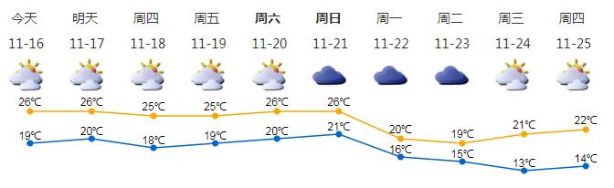 我市今天多云,部分时间可见阳光,空气干燥;气温19-26℃;东北风2-3级;相对湿度40%-70%。