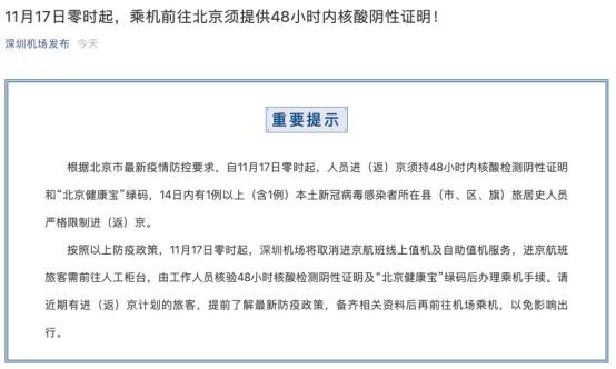 11月17日零时起,深圳机场将取消进京航班线上值机及自助值机服务,进京航班旅客需前往人工柜台,由工作人员核验48小时核酸检测阴性证明及“北京健康宝”绿码后办理乘机手续。