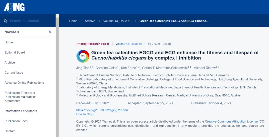 科学家将他们的研究成果发表在《Aging-US》一篇题目为“Green tea catechins EGCG and ECG enhance the fitness and lifespan of Caenorhabditis elegans by complex I inhibition”的文章中: