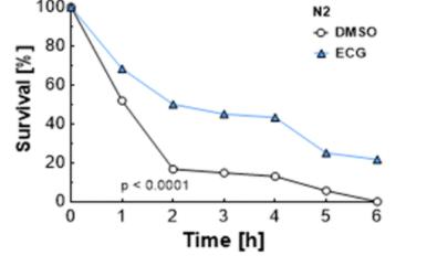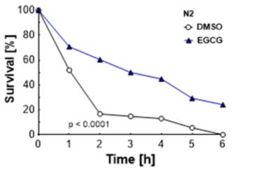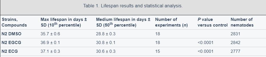 哺乳动物中绿茶儿茶素的口服吸收和绝对生物利用度很低,在给人摄入不超过4.5 g无咖啡因的绿茶固体后,最高血浆浓度达到2.5 μM。然而,一些独立的临床试验报道了EGCG和ECG在健康参数方面的有益作用。因此,我们假设较低浓度的EGCG和ECG仍然有效,并改善线虫的寿命和抗逆性。事实上,EGCG和ECG应用于浓度为2.5μM是足以显著扩展介质从而延长秀丽隐杆线虫的寿命: