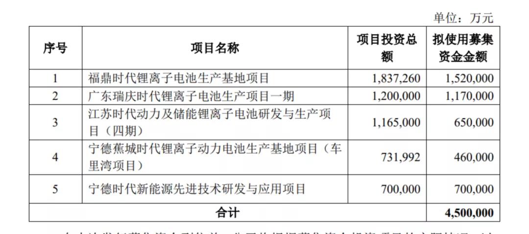 上述公告显示,福鼎时代锂离子电池生产基地项目、广东瑞庆时代锂离子电池生产项目一期、江苏时代动力及储能锂离子电池研发与生产项目(四期)项目的投资总额及拟使用募集资金金额未发生变化。