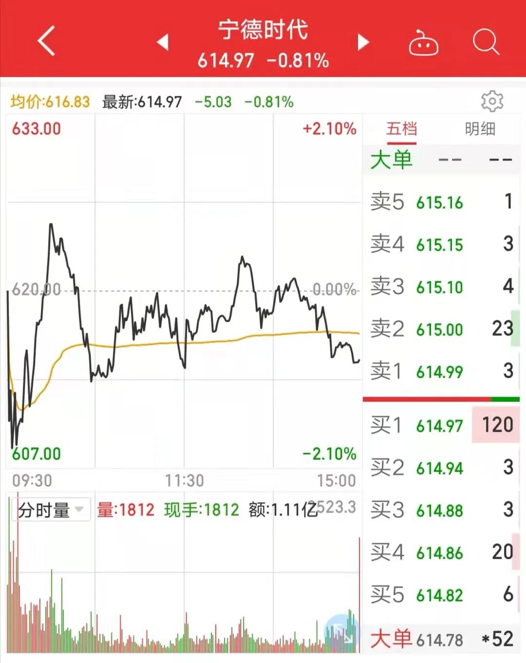 截至11月16日收盘,宁德时代股价跌0.81%至614.97元,总市值为1.43万亿元。