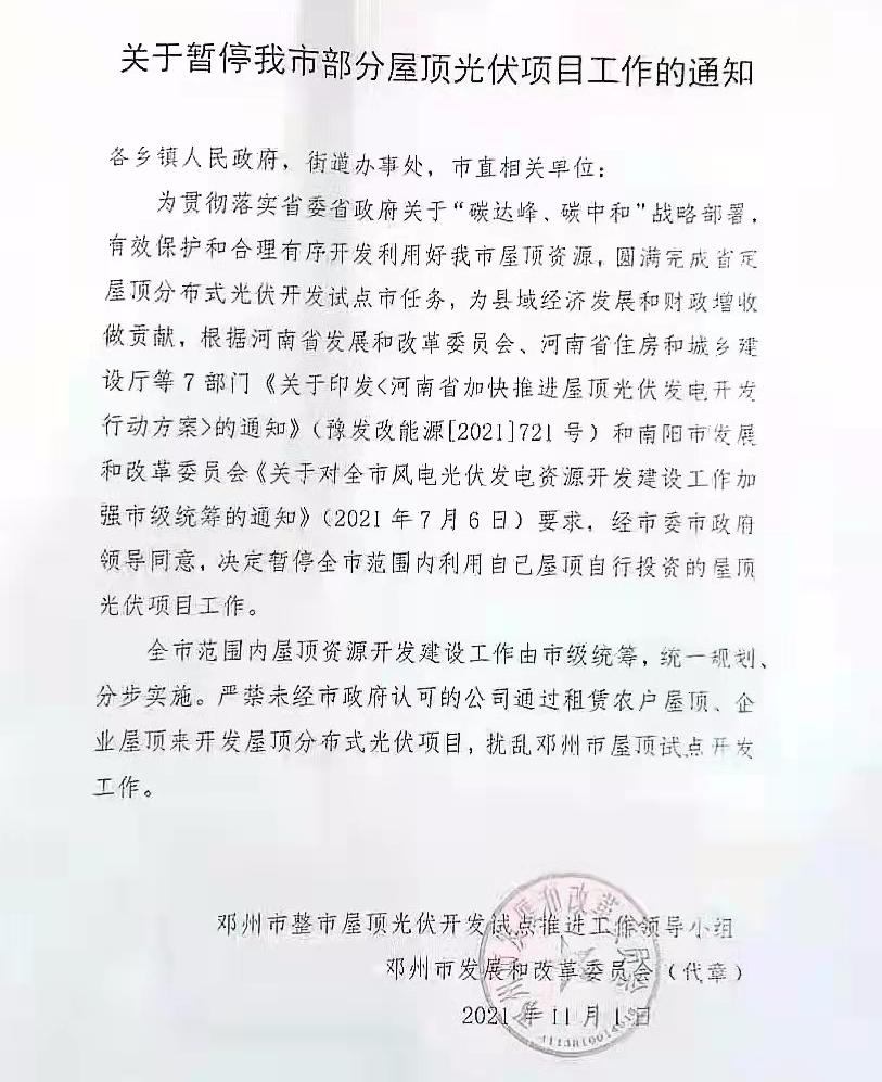 <河南省加快推进屋顶光伏发电开发行动方案>的通知》(豫发改能源[2021]721号)和南阳市发展和改革委员会《关于对全市风电光伏发电资源开发建设工作加强市级统筹的通知》(2021年7月6日)要求,经市委市政府领导同意,决定暂停全市范围内利用自己屋顶自行投资的屋顶光伏项目工作。河南省加快推进屋顶光伏发电开发行动方案>全市范围内屋顶资源开发建设工作由市级统筹,统一规划、分步实施。严禁未经市政府认可的公司通过租赁农户屋顶、企业屋顶来开发屋顶分布式光伏项目,扰乱邓州市屋顶试点开发工作。