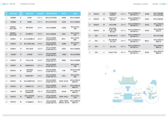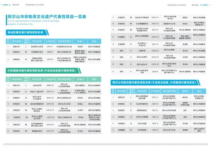 为更好地宣传阿尔山市的非物质文化遗产,近日,阿尔山市文化旅游体育局设计印制了《阿尔山非遗手册》和《阿尔山市非遗地图》,全面介绍了阿尔山市的非遗特色、各级非遗项目情况,并重点选取了10项具有代表性的非遗项目以及其传习体验场所,供市民、游客了解、参观、体验。