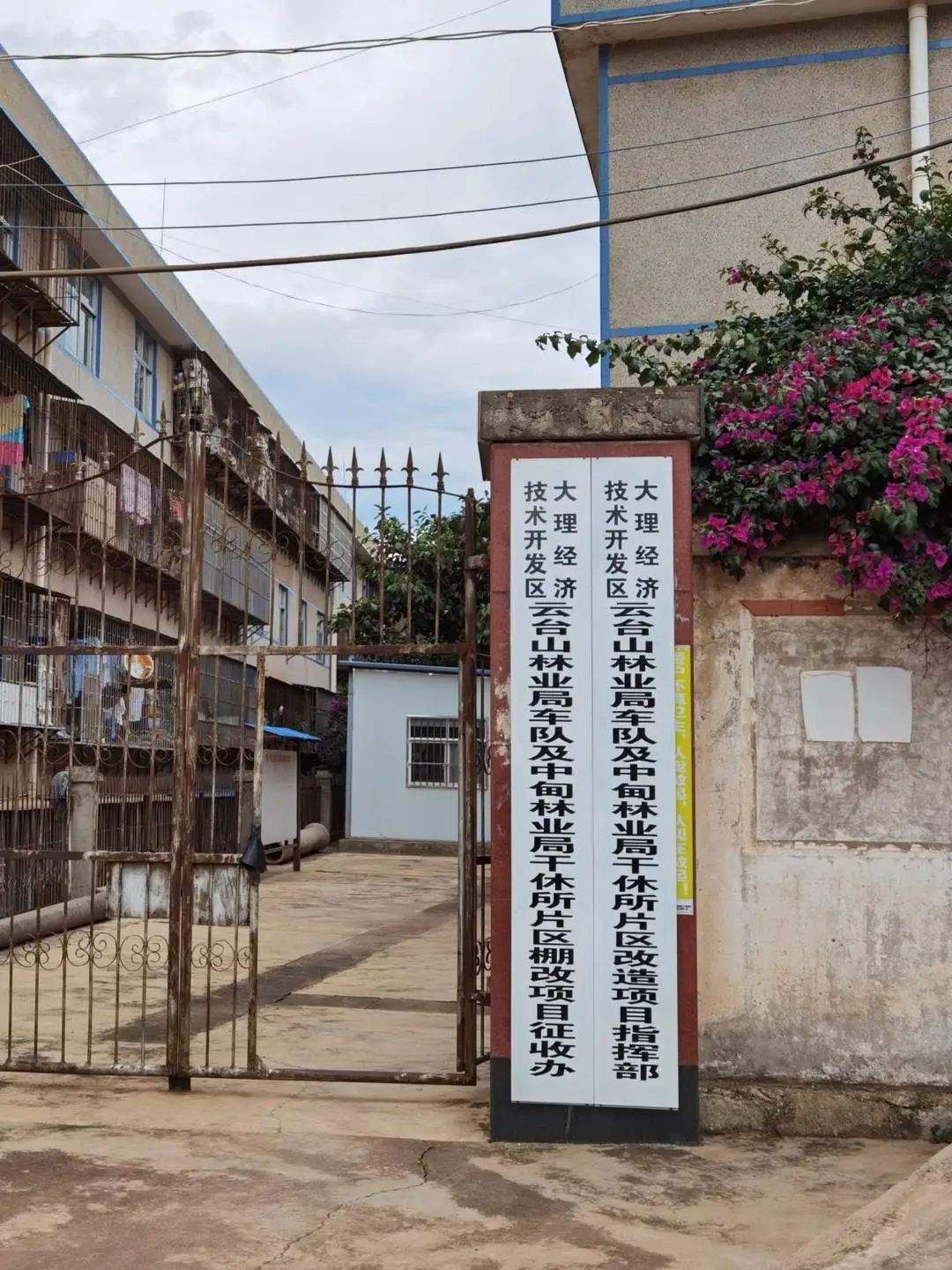 一个探出盛开的三角梅的大门,挂着“云台山林业局车队及中甸林业局干休所片区改造项目指挥部”的牌子。“云南省中甸林业局”——是个1997年被撤销,如今已不存在的单位。1975年12月,张桂梅参加工作,即在这个“中甸林业局”,中甸县后面改名为香格里拉市,但“中甸林业局”并非隶属于当时的中甸县,而是归云南省林业厅管。林业局老职工曾科,为我们揭开了一段尘封的经历。