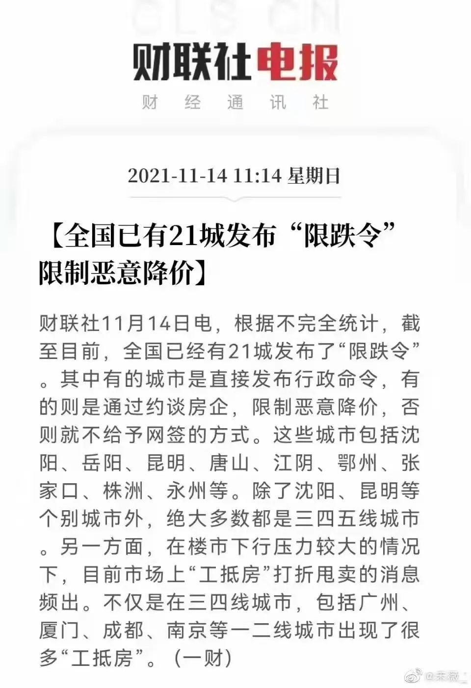 目前,至少已有21个城市出台了“限跌令”,要求房价降价不得超过10%或15%,同时明确指出打击恶意降价行为。