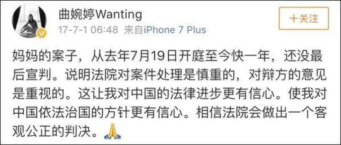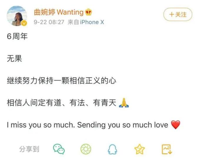 去年9月份,曲婉婷曾在微博发文,“6周年,无果,继续努力保持一颗相信正义的心。”引发网友热议。