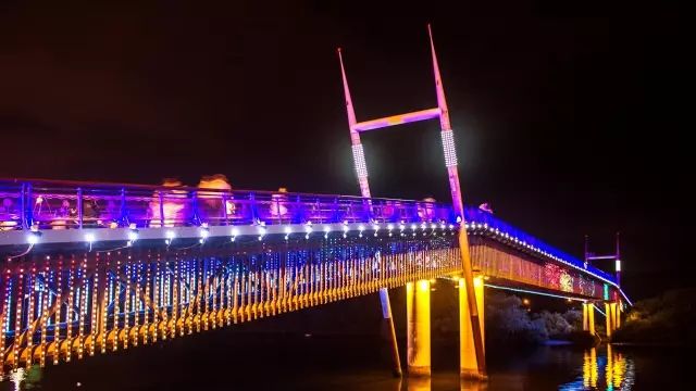 三亚步行桥,位于三亚河畔,是一座横跨三亚河西河东两岸的的木质桥,夜景下的三亚步行桥美的虚幻,桥蛟龙弯曲的形状加上五彩绚丽霓虹灯,仿佛似一条活龙从水中跃起,在桥道上经常有停留着小憩的市民和观光的游客、有行色匆匆的人流,当然还有牵手的情侣,走在弯曲的小桥上,感受都市生活些许休闲俏皮。