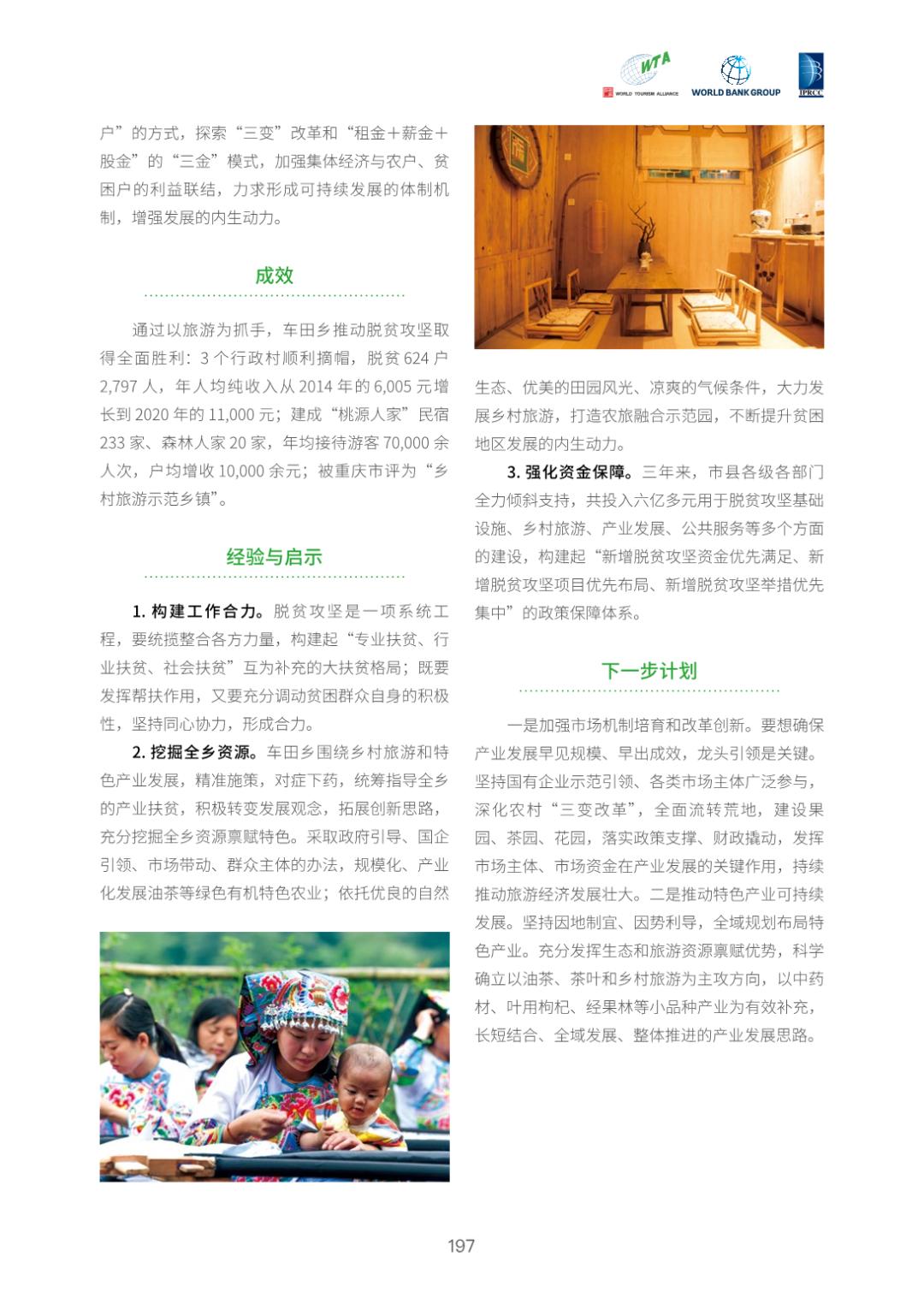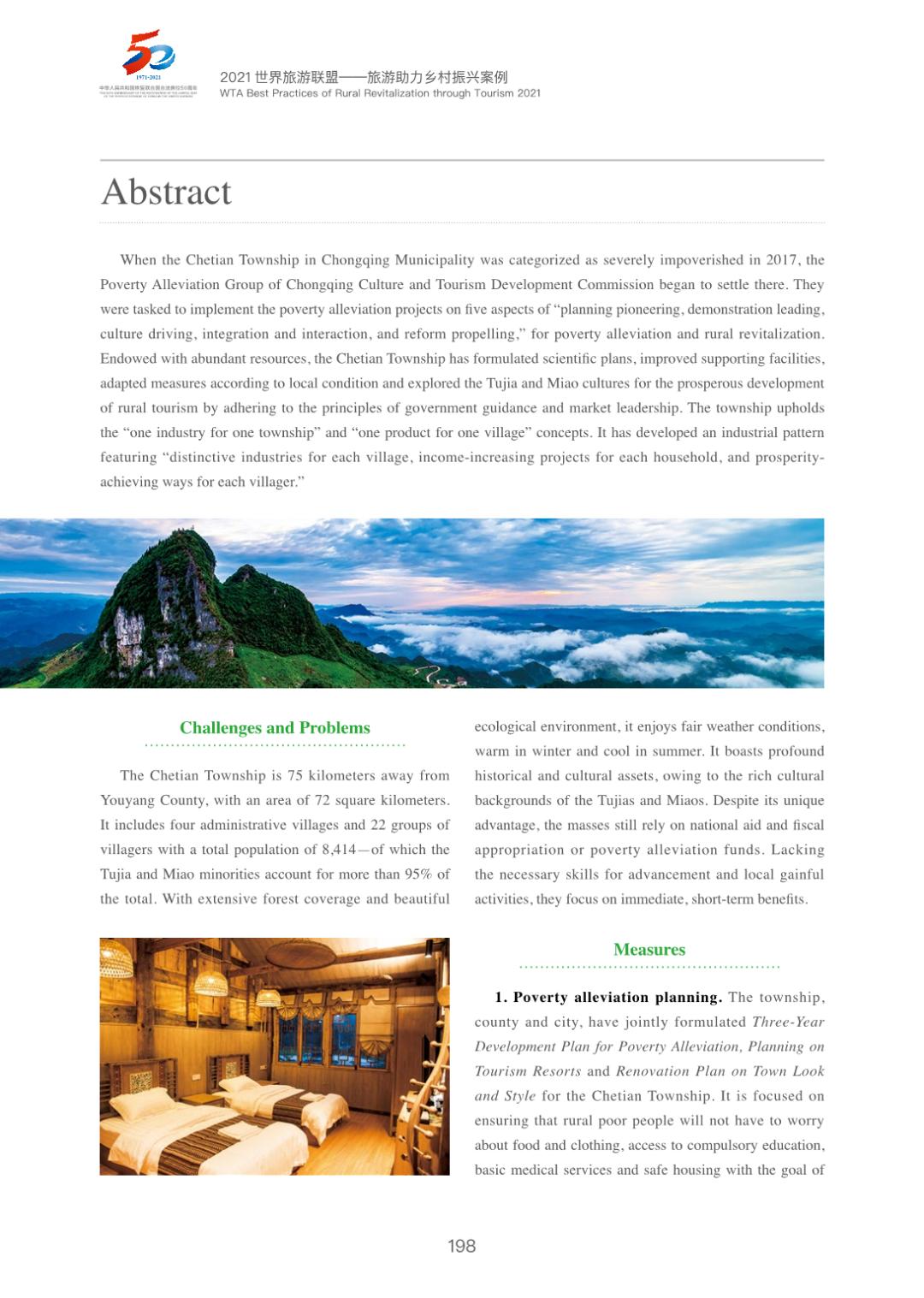 2021年是中国巩固拓展脱贫攻坚成果同乡村振兴有效衔接的起步之年,值此之际,世界旅游联盟联合世界银行和中国国际扶贫中心开启旅游助力乡村振兴新篇章,共同发布《2021世界旅游联盟——旅游助力乡村振兴案例》。通过世界旅游联盟会员单位、中国文化和旅游部、国家乡村振兴局、各省级文化和旅游部门等,多渠道广泛征集相关案例。根据可量化的效果、创新性、可复制性、积极的社会影响、可持续性和提交材料质量等标准,最终确定50个典型案例。经中国文化和旅游部推荐,本书被列入纪念中华人民共和国恢复联合国合法席位50周年配套活动之一。