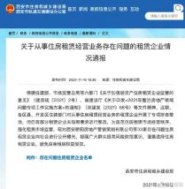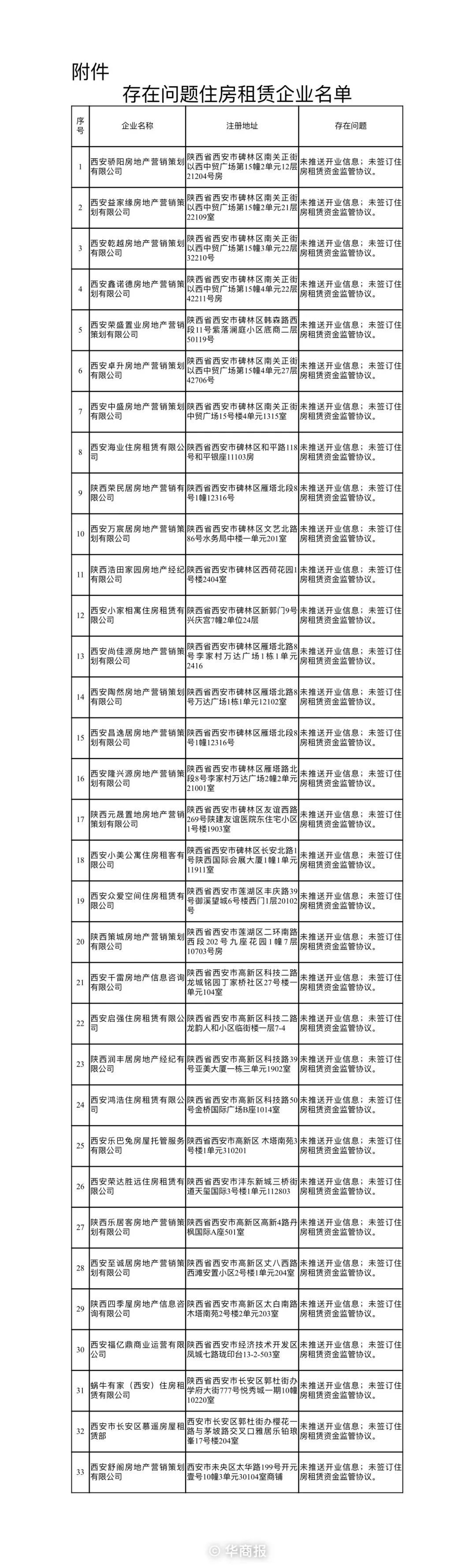 ▲西安住建通报33家存在问题住房租赁企业近期,各区县、开发区住建部门对从事住房租赁经营业务的租赁企业开展了专项排查整治,但仍有部分租赁企业未按照要求进行整改,为规范住房租赁市场经营秩序,强化租赁市场监管,现对西安骄阳房地产营销策划有限公司等33家存在问题住房租赁企业向社会进行公开曝光,提醒广大群众提高风险防范意识,谨慎选择住房租赁企业,避免自身租房权益受损。