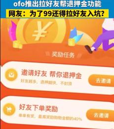 ▲近日,ofo商城推出拉好友帮退押金功能。网友发现,除了“邀请好友,帮你退押金”外,还有好友下单奖励、充值退押等功能。退还押金本来是消费者的合法权益,ofo却“花招百出”、“百般阻挠”,引发网友调侃。做个小调查,你的ofo押金退款成功了吗?