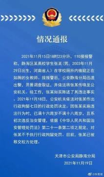 ▲据天津静海公安,2021年11月15日18时23分许,110接报警称,静海区某高校学生张某(男,2003年11月29日出生,河南省人)在学校厕所内偷窥正在如厕的女教师。接报警后,公安静海分局迅速出警,开展调查取证,并依法将张某传唤至公安机关。经工作,张某如实陈述了其违法事实。2021年11月18日,公安机关依法对张某作出行政拘留七日的行政处罚决定。因张某实施违法行为时,已满十六周岁不满十八周岁,且系初次违反治安管理,依据《中华人民共和国治安管理处罚法》第二十一条第二项之规定,对张某不予执行行政拘留处罚。目前,张某已被移交校方处理。