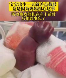 ▲近日,湖南郴州。一名出生刚一天的宝宝,手臂绑了一根皮筋导致肿胀发黑,送往医院被确诊患上骨筋膜室综合征。原来,孩子的家长将橡皮筋捆扎在孩子的左前臂,差点导致孩子截肢。据了解, 妈妈当心宝宝左臂手的衣服会缩上去 所以用了一根橡皮筋,扎在左上前臂。扎完之后就把这件事情忘了,到了第二天早上7点,爸爸发现不对,宝宝手指头变黑了。入住新生儿重症监护室后,医院联合救治,成功保住了小宝宝险些截肢的手臂。