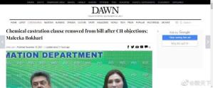 ▲巴基斯坦黎明报当地时间19日报道,周三,巴基斯坦议会通过一项新的刑法修正案,其中规定化学阉割可以作为对强奸惯犯、轮奸和恋童癖罪犯的惩罚。周五,巴基斯坦国会法律和司法秘书玛莉卡·博哈里和巴基斯坦司法部长纳西姆在记者会上表示,鉴于伊斯兰意识形态委员会(CII)提出的反对意见,对惯犯实施“化学阉割”的条款从反强奸刑法修正案中删除。博哈里称,根据巴基斯坦《宪法》第227条规定:保证所有法律必须符合伊斯兰教法。