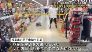 ▲据日本NHK电视台消息,19日,北海道根室市一家购物中心内,一名14岁中学生持刀将一名女店员砍成重伤,后被警方以杀人未遂嫌疑逮捕。被捕后,该学生称袭击陌生人理由是“当时心烦意乱”,警方正对此案进行详细调查。当地时间19日下午1时半左右,北海道根室市一家购物中心2层书店里,这名14岁男学生突然挥刀砍向50余岁女店员,致店员脸部、颈部等十余处地方受伤。警方在事发现场附近的公路上将涉事学生当场逮捕。被捕时,学生手中还拿着长15公分的刀。