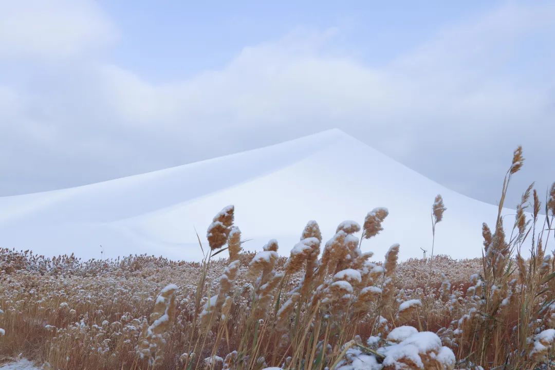 11月20日凌晨,敦煌迎来2021年入冬以来首场雪。上午10时左右,敦煌大漠雪后天气放晴,被白雪覆盖着的大漠山川银装素裹,显得分外妖娆。远望,鸣沙山白雪茫茫,沙雪交融;眼前,硕大的芦花,在风中摇曳,抒写着只属于冬日沙漠的诗情画意,呈现出难得一见的北方雪国风情。