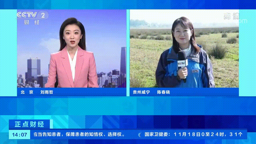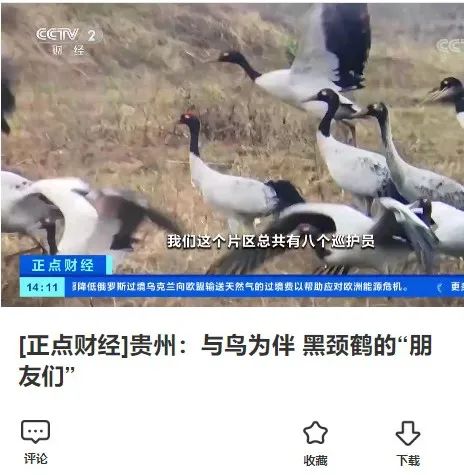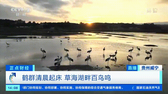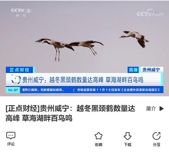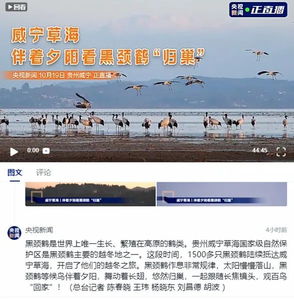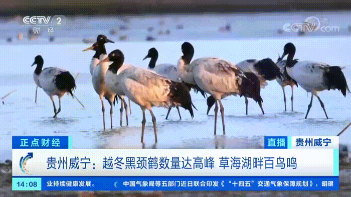 11月19日,中央电视台财经频道等分别以“越冬黑颈鹤数量达峰值 草海湖畔百鸟鸣”“与鸟为伴 黑颈鹤的‘朋友们’”以及“伴着夕阳看黑颈鹤‘归巢’”为主题,以视频连线的方式,全方位、多角度地把镜头对准了从若尔盖草原到贵州威宁草海国家级自然保护区越冬的黑颈鹤。在直播画面中,观众们可以看见,黑颈鹤有的展翅飞翔、有的蹁跹起舞,不时可以听见黑颈鹤欢快的鸣叫声,十分惹人喜爱。