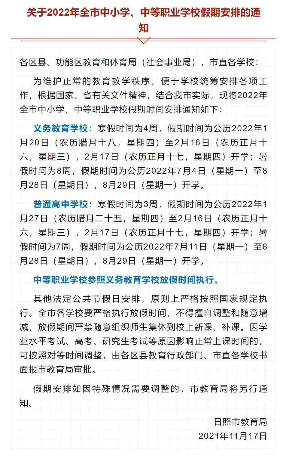 近日,日照市教育局印发《关于2022年全市中小学、中等职业学校假期安排的通知》,对2022年全市中小学、中等职业学校放假时间作出安排。