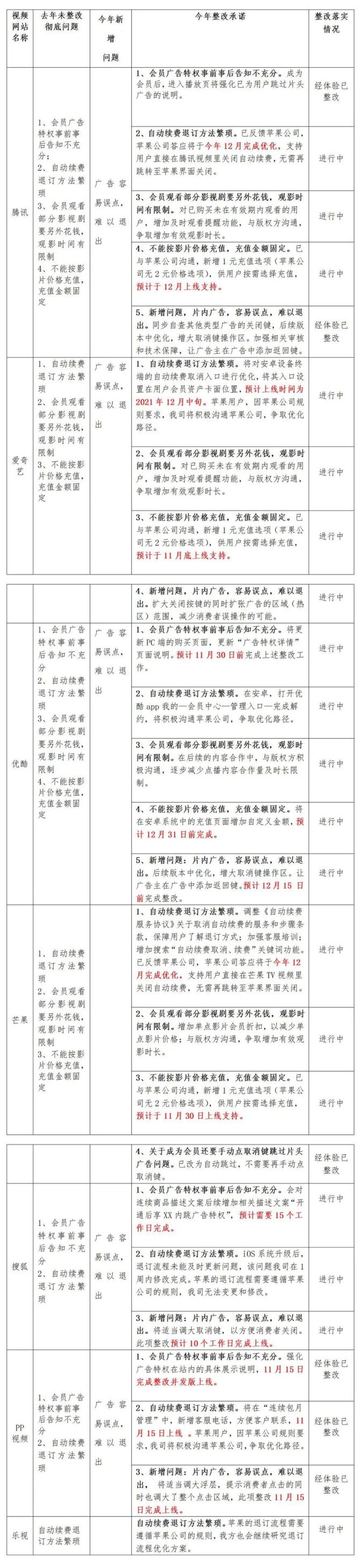 11月19日,记者从浙江省消保委获悉,自7家视频网站(腾讯、爱奇艺、优酷、芒果、搜狐、PP视频、乐视)就会员服务问题提交整改报告的7天后,浙江省消保委将各视频网站的整改承诺及整改进展情况予以公开,请广大消费者共同监督。去年,浙江省消保委约谈提出的7项问题,7家视频网站全部整改有3项:1、取消强制自动续费,用户可以自行选择是否自动续费;2、自动续费前,会通过手机短信、站内消息等方式提前3-5天告知用户;3、不再使用“开通会员免广告”等绝对宣传用语。今年各视频网站整改报告及整改落实情况汇总如下: