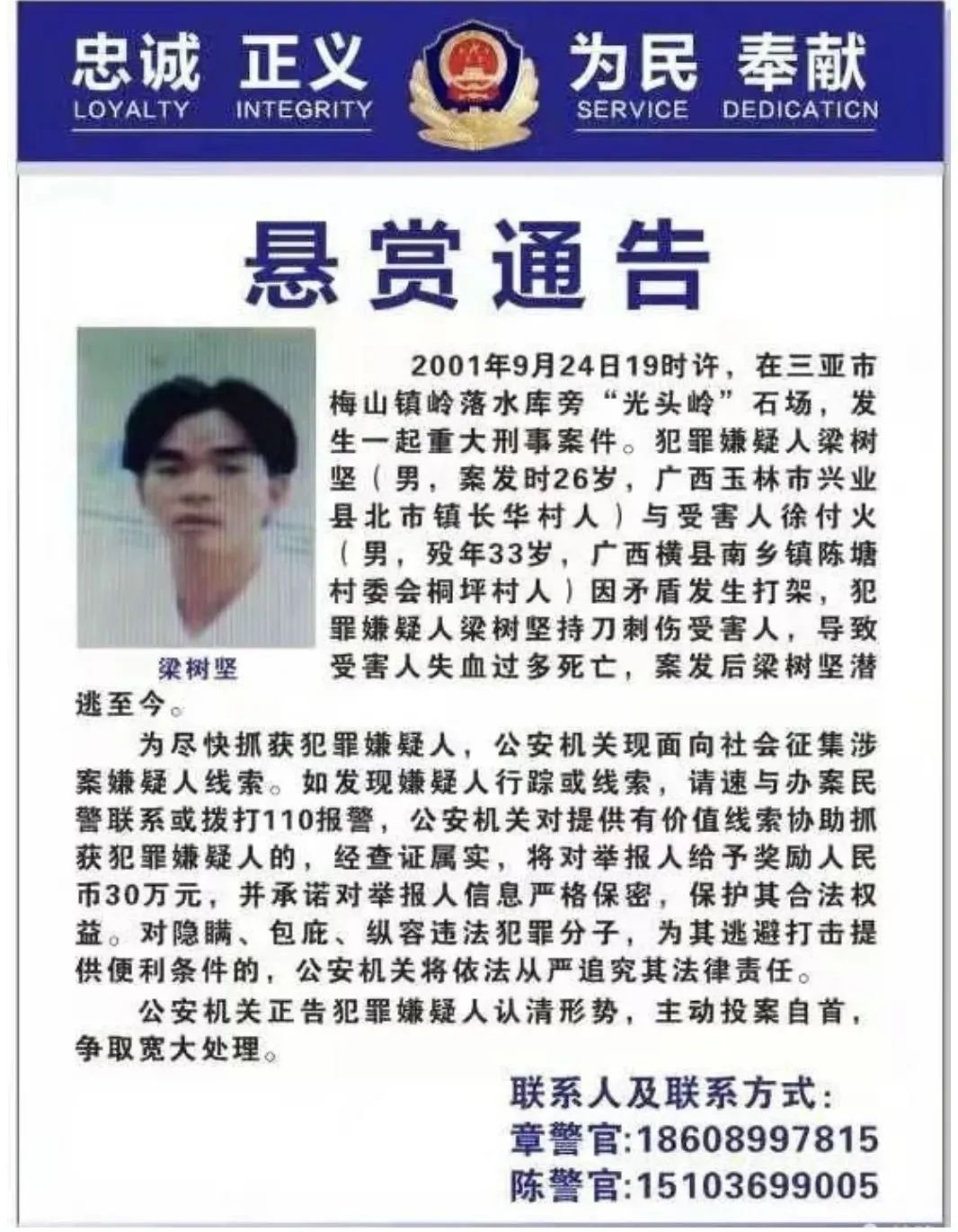 1、2001年9月24日19时许,在三亚市梅山镇岭落水库旁“光头岭”石场发生一起重大刑事案件。犯罪嫌疑人梁树坚(男,案发时26岁,广西玉林市兴业县北市镇长华村人)与受害人徐付火(男,殁年33岁,广西横县南乡镇陈塘村委会桐坪村人)因矛盾发生打架,犯罪嫌疑人梁树坚持刀刺伤受害人,导致受害人失血过多死亡,案发后梁树坚潜逃至今。