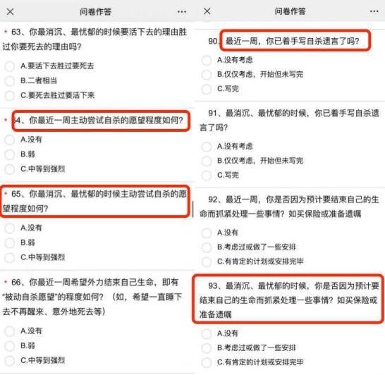 问卷满屏讨论近期与以往的自杀念头,反复强化想不想死,想怎么死,什么时候想死,还有什么阻止你死,遗书写没写,有没有瞒着别人死。