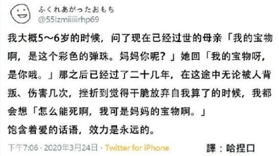 我5、6岁的时候,问了现在已经过世的母亲:“我的宝物,是这个彩色的弹珠,妈妈你呢?”