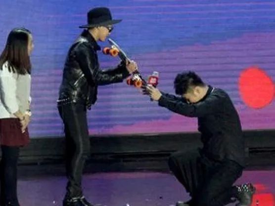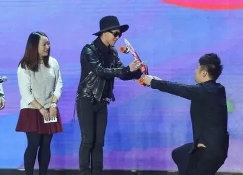他对着韩国偶像权志龙单膝下跪,颁奖。
