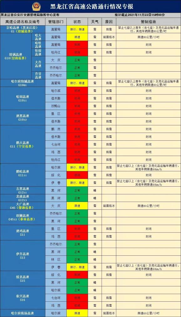 2021年11月22日15时,黑龙江省公安厅交通管理局指挥中心发布全省高速路况最新动态,受暴雪的影响,目前黑龙江省内已有多条高速路段封闭。交管部门建议,非必要尽量不要冒雪出行。