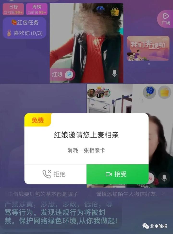 “欢迎小灰灰!”见有异性进入,红娘迅速发来一张“连麦卡”,邀请记者进入直播间。记者点击拒绝后,她便继续招徕其他围观者,仿佛只要有人和女嘉宾“连麦”就行,至于相亲者是谁,根本不重要。