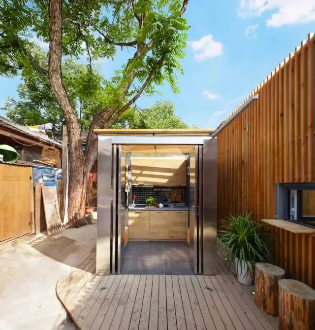 尤其是后来为屋主邻居一起做的伸缩院子,极具和式风格,打开棚顶和桌子就能轻松达成8人的用餐需求。