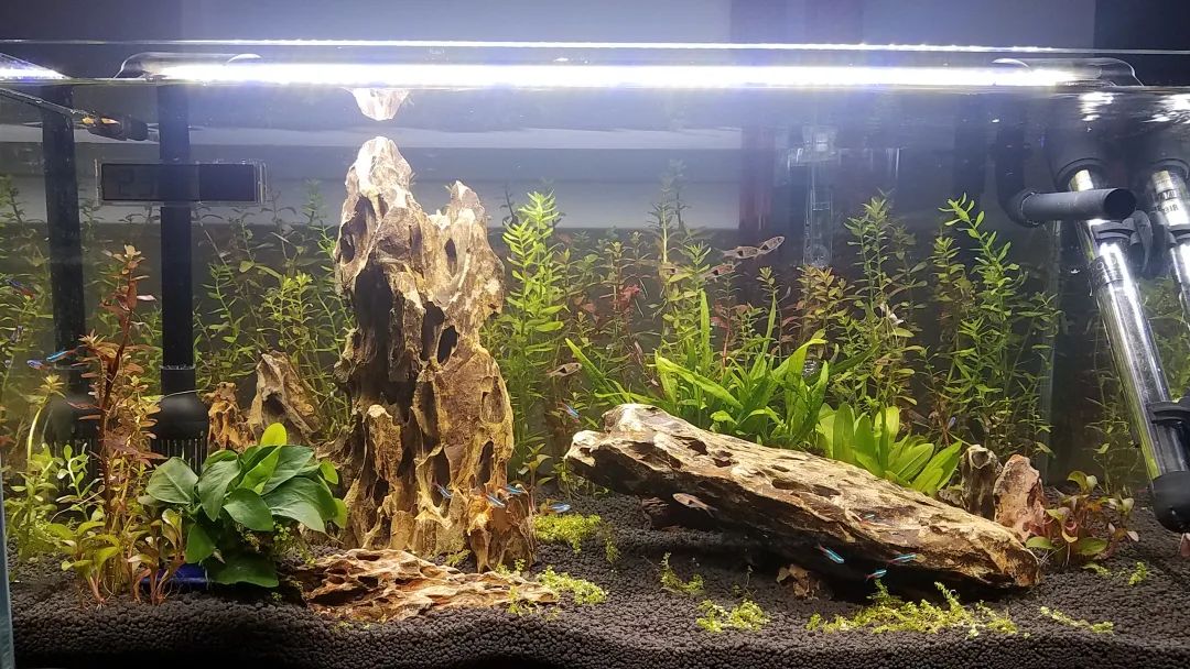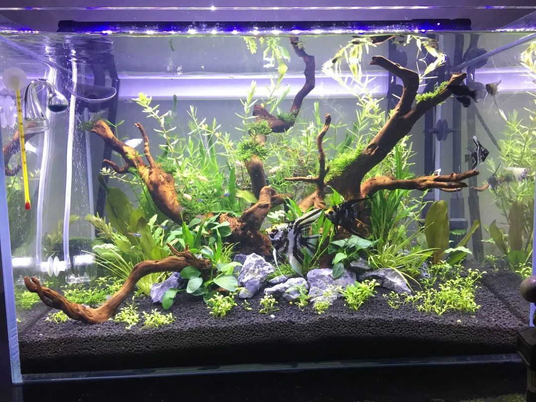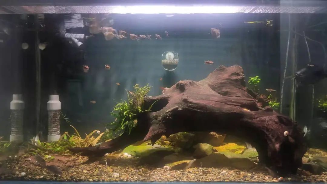 平时底层鱼会躲在沉木里,上层鱼跟中层鱼就会让鱼缸显得不那么空,群游效果也不错。水里的植物和过滤里水培的植物,都会消耗鱼缸里的氨氮类物质;过滤里的细菌屋,以及能够培养硝化细菌的培养材料,也会平衡鱼缸里的菌群和氨氮类物质。