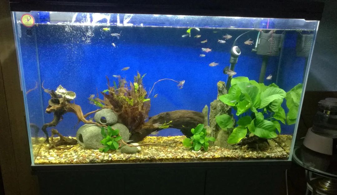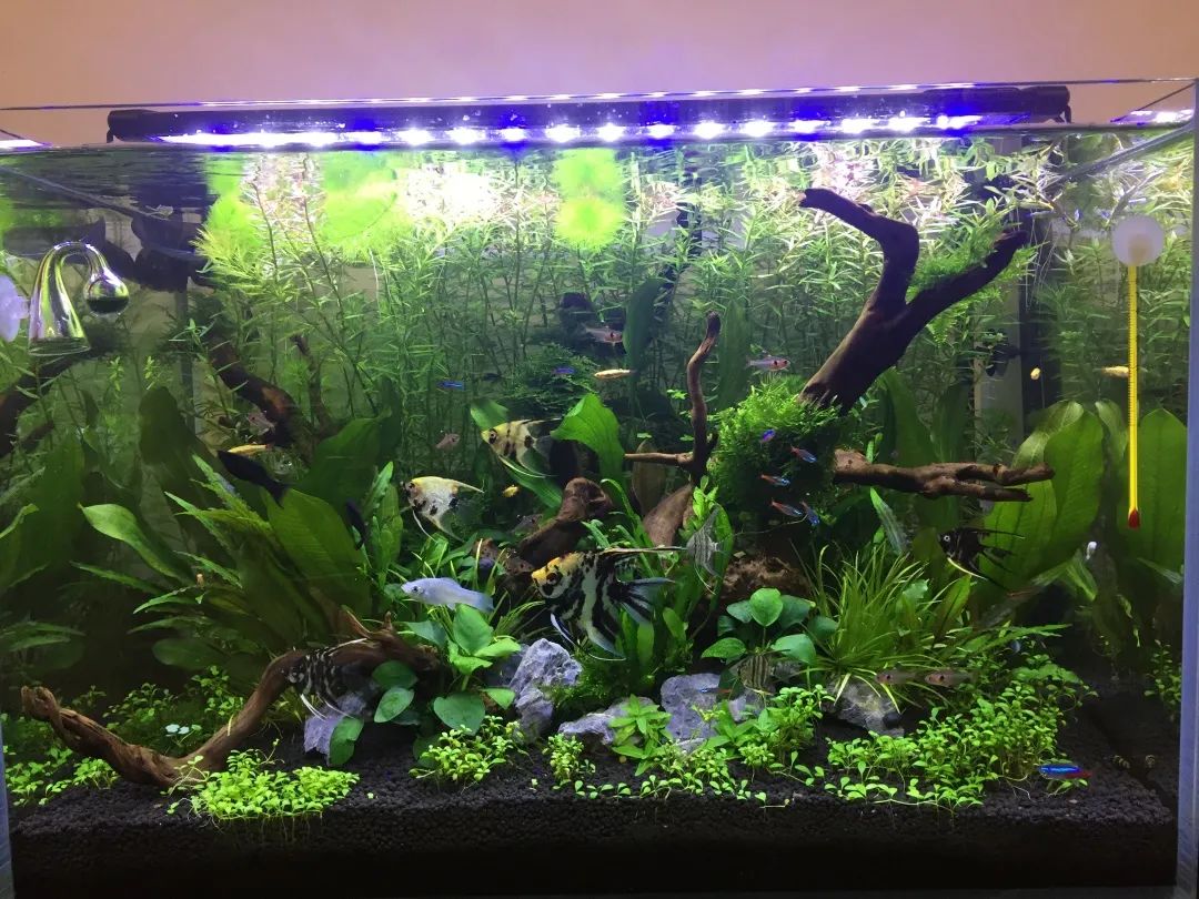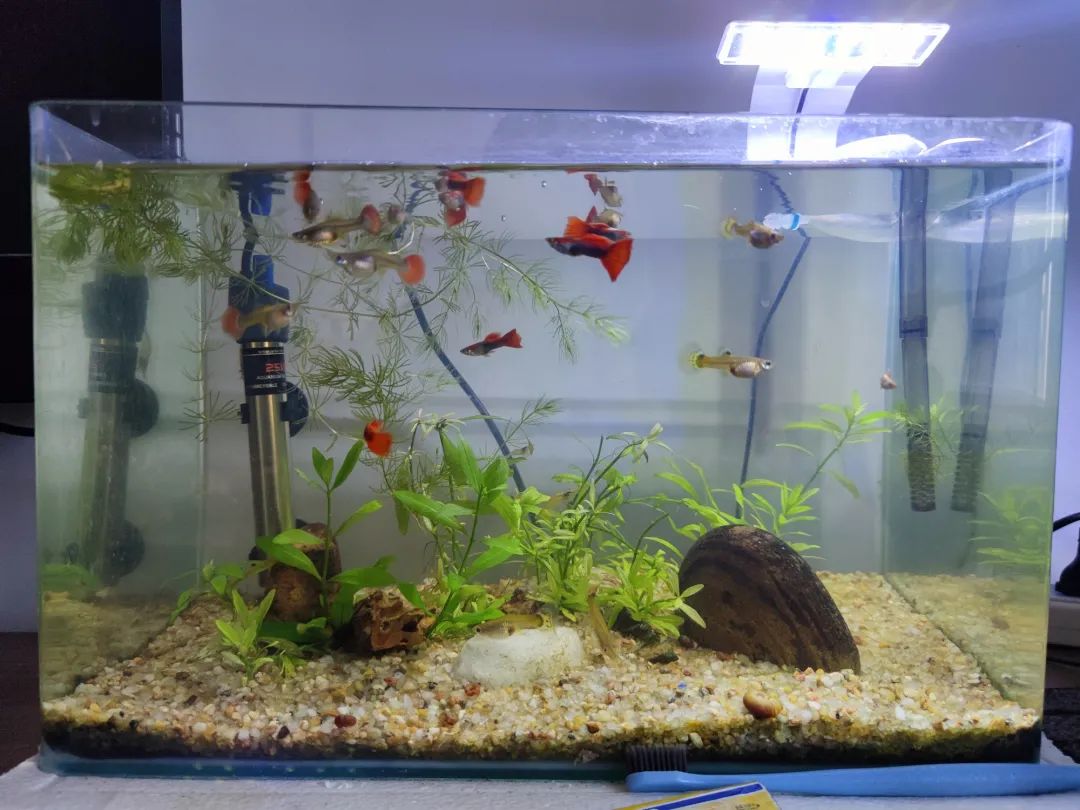 从高中开始养鱼,现在都快大学毕业了,养了孔雀鱼(也就是凤尾鱼)、灯科鱼(灯科鱼是一大类颜色鲜艳或体型好看的小型淡水鱼)、虾。最近2年内,鱼缸都能保持稳定的状态。唯一的不足是,这是一个水族箱,窄而深,不方便打理水草。