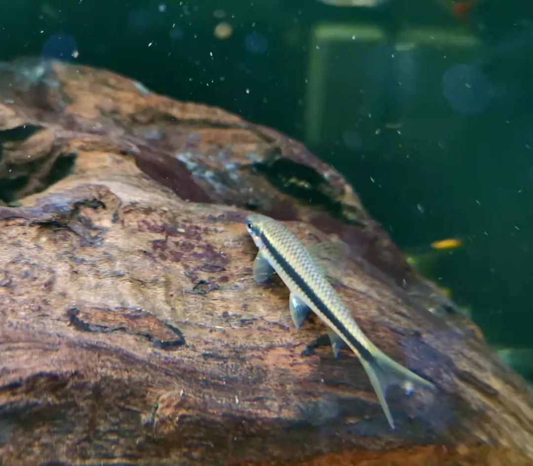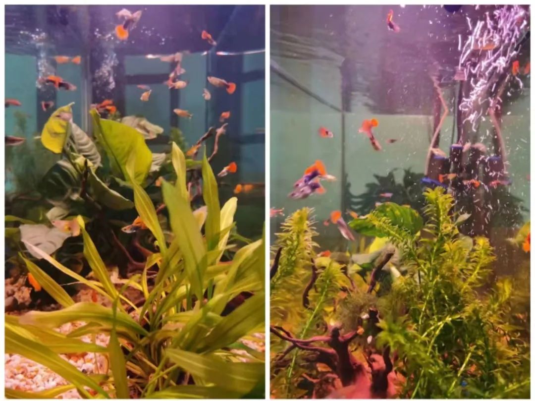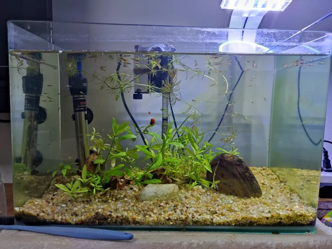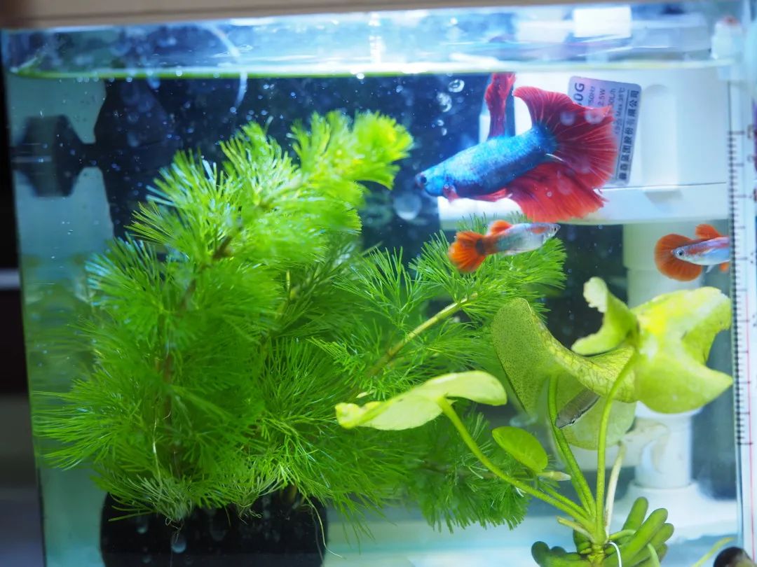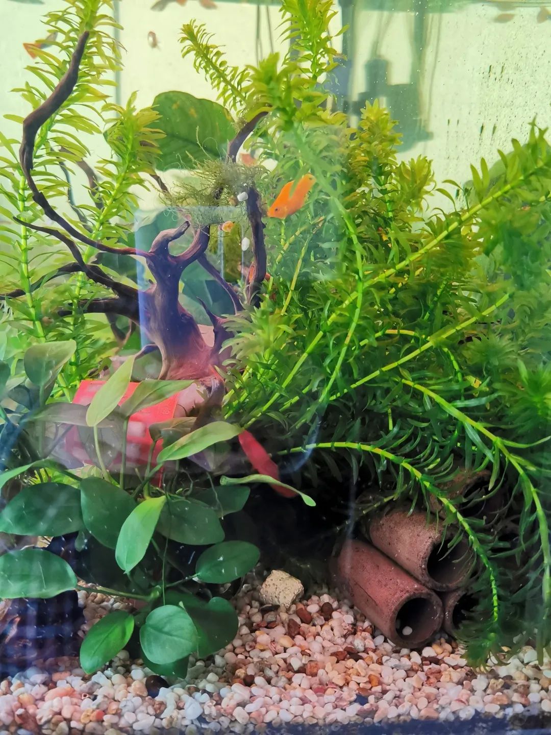 除了孔雀鱼,鱼缸里还有黑线飞狐(吃绿藻等鱼食垃圾)、泰国斗鱼(以好斗而闻名的鱼)、蛇仔鱼(库勒潘鳅,和泥鳅是一个科的)和金刚螺。养泰国斗鱼是馋它的颜,斗鱼入缸混养很温和,游得没别人快,对其他鱼也不能一口吞。缸里还加了过滤和水草,因为缸太小,没用水草泥。