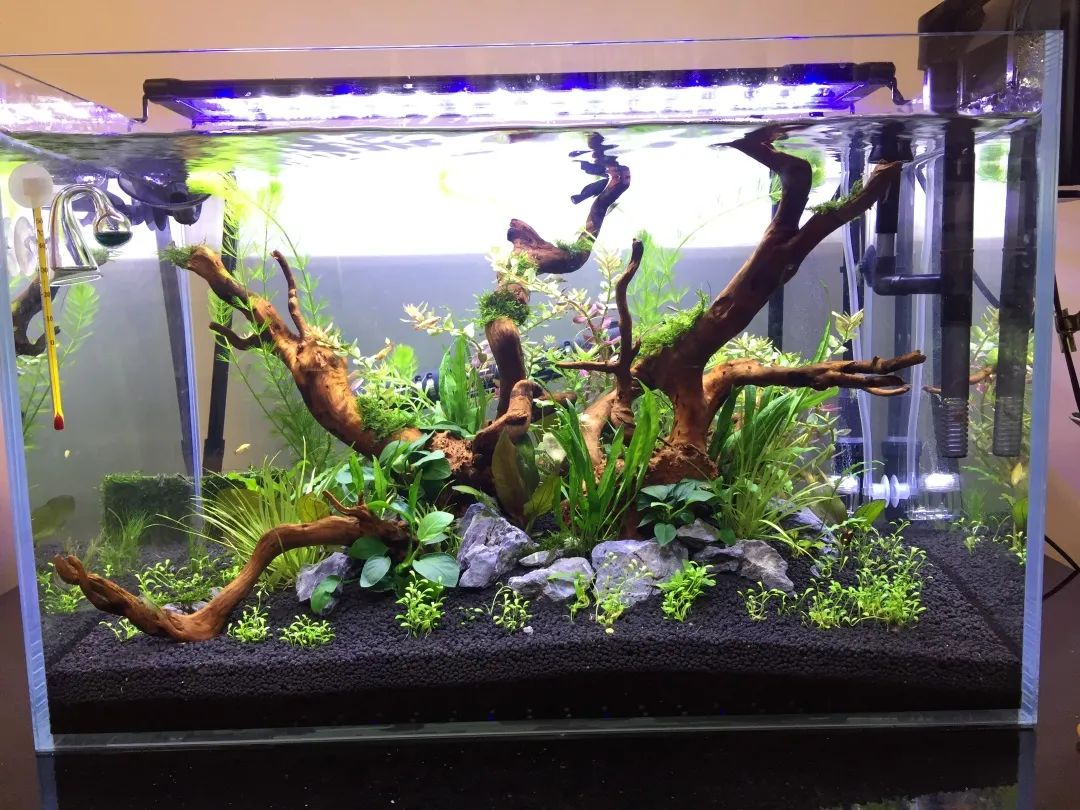 我用的花架上的植物补光灯,一天自动10小时,结果爆藻,天天得清理。有条件的话,可能还是得用普通日光灯。鱼缸一定要加个盖,网子那种就行,不然鱼一不注意就跳缸。