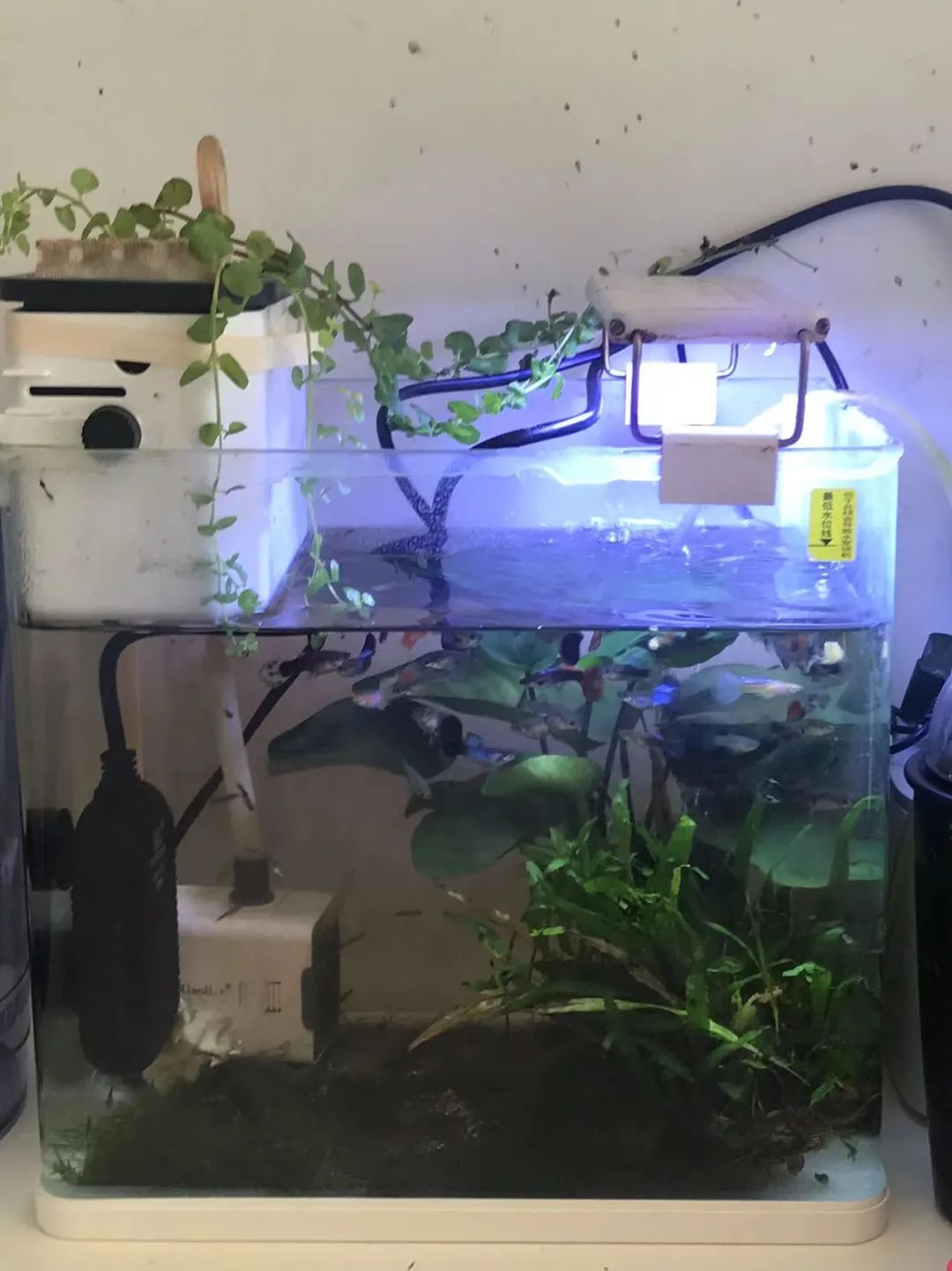 后来,孔雀鱼每个月都能下几十条崽。 我只好给它搞了个育婴缸,不知是幸还是不幸,母鱼下了一窝后死了。我又送了一点鱼宝宝给亲戚,现在固定五条公鱼,再也不会多了。