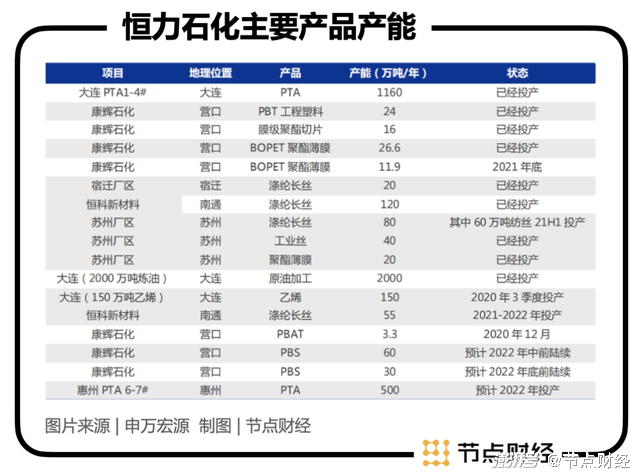 目前,在上游方面,恒力石化拥有2000万吨炼化一体化项目,配套450万吨PX产能;中游方面,现阶段拥有PTA产能1160万吨,为全球单体最大的PTA工厂;下游方面,恒力石化的产品种类比较丰富,比如涤纶民用长丝、工业长丝、聚酯切片、工程塑料、聚酯薄膜、PBAT等等,详细信息可以参考下图。