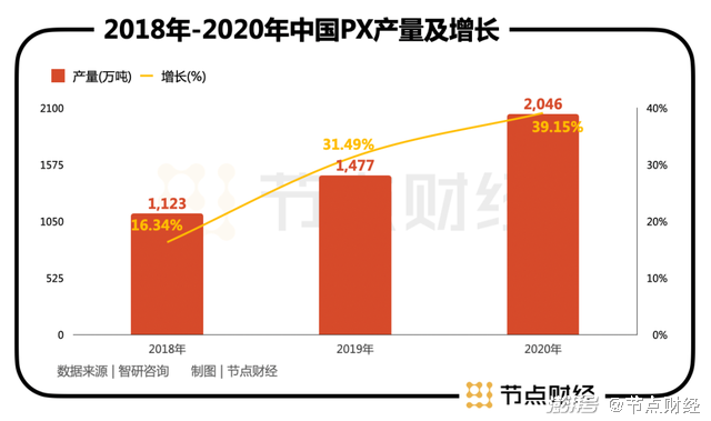 同时,国内PX产能的释放也在加快。2018年-2020年,国内PX产量分别为1123万吨、1477万吨和2046万吨,增速分别约为16.34%、31.49%和39.15%。按照这个速度,国内PX产量有可能在数年内解决对外依存的问题,最终进入饱和竞争。