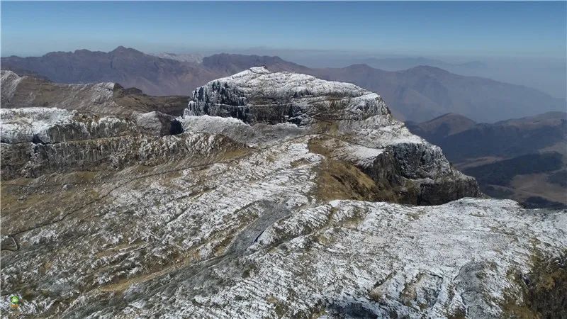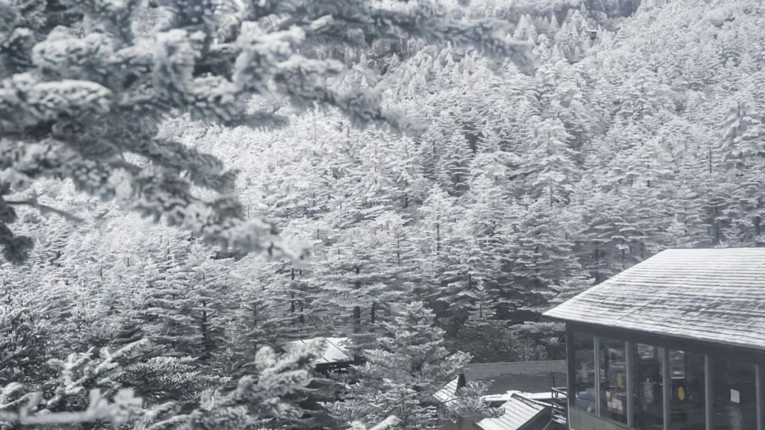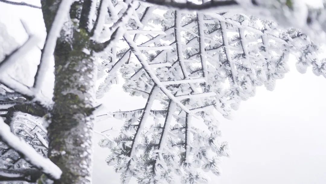 作为中国纬度较低的季节性雪山,轿子雪山最高海拔4223米,冬春两季山顶会有积雪。树梢上挂满冰渣,树枝上结出“雾凇”。
